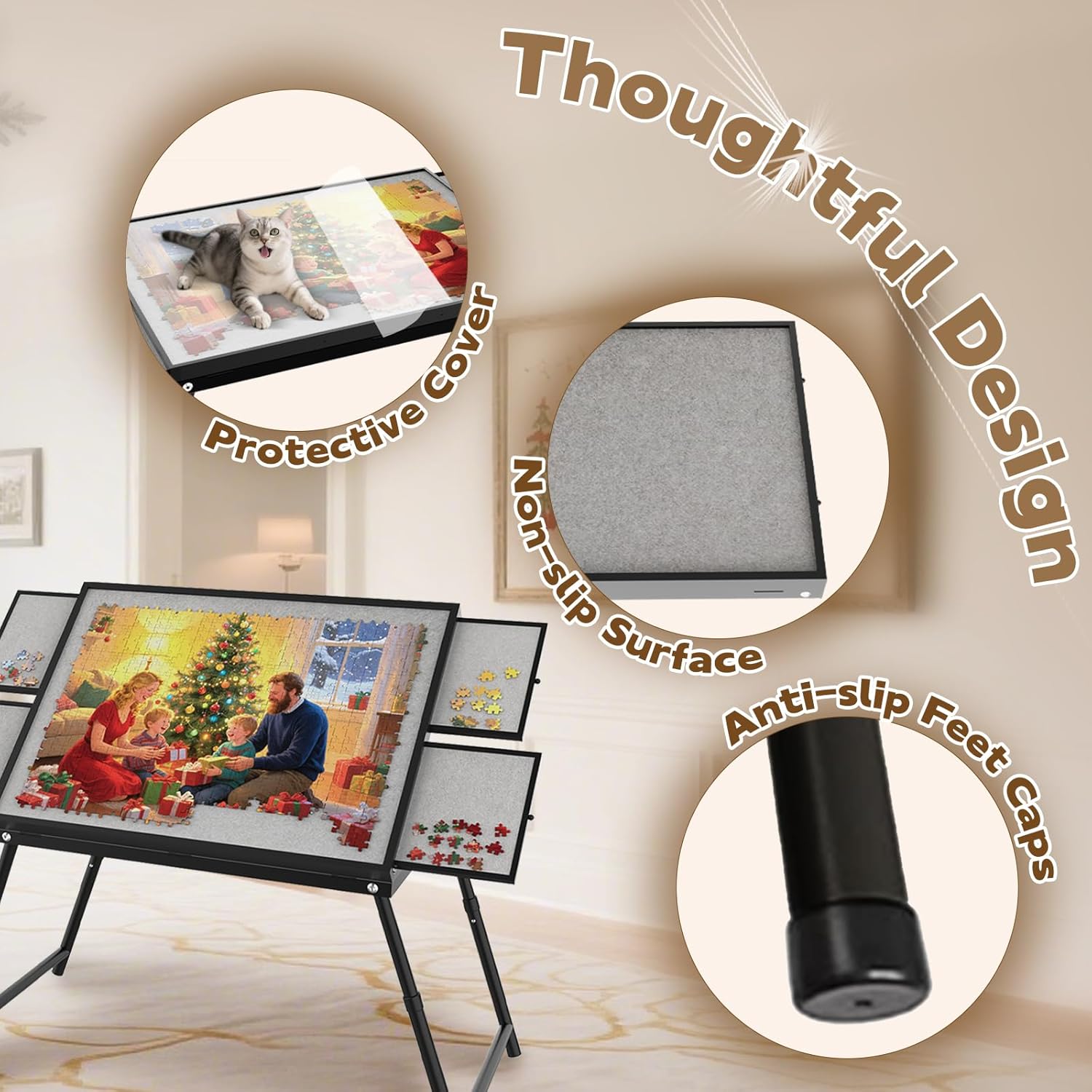 - Thoughtful design: Adjust your puzzling angle with five height settings to reduce neck and back strain. The included protective cover of the puzzle table for adults with drawers shields your unfinished puzzles from dust, moisture, and pet interference, allowing you to pause and resume your puzzles at any time without worrying about damage or disarray.